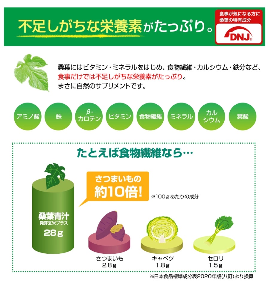 桑葉にはビタミン・ミネラルをはじめ、食物繊維・カルシウム・鉄分など、食事だけでは不足しがちな栄養素がたっぷり。